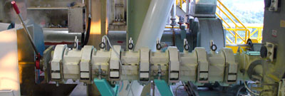 A steam lock (choke plate) system is used to maximise shear rate in the extruder along with an adjustable outlet nozzle.