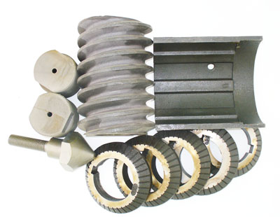 Typical parts for Full Fat Soya processing; Ni-hard double flight screw, Ni-hard barrel liner, Ni-hard choke plates, Nozzles and Conical nose bolt